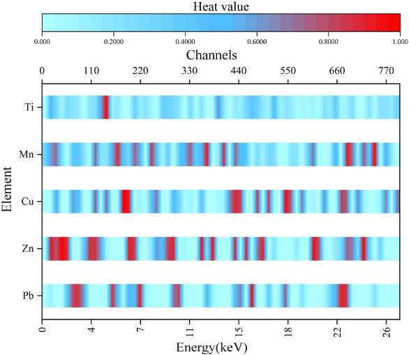 论文使用 Grad-CAM 类可视化技术在能量谱(channel→keV)上生成热力图,直接展示模型“关注”的谱段:这既验证了模型并非“黑盒瞎猜”,也为专家复核提供了直观依据(例如:Ti 的预测集中在其特征峰附近,而 Cu/Zn/Pb 的关注区域更分散,解释了它们易受干扰的本质)。该可视化对产业化部署时的合规与标准化极为重要。