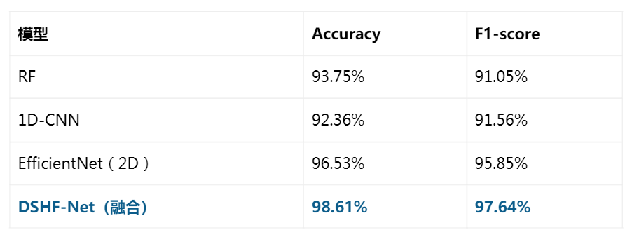 在 6 类矿石、144 个样本的数据集上,DSHF-Net 在 5-折交叉验证下取得 总体准确率 98.61%,并在多数类别上实现接近或达到无误判的分辨能力。与传统机器学习(RF、SVM)与单模态深度模型对比,整体性能显著提升(见表)。